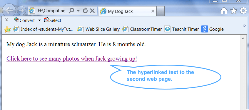 <a href="mySecondWebPage.html">Click here to see many photos when Jack growing up!</a>