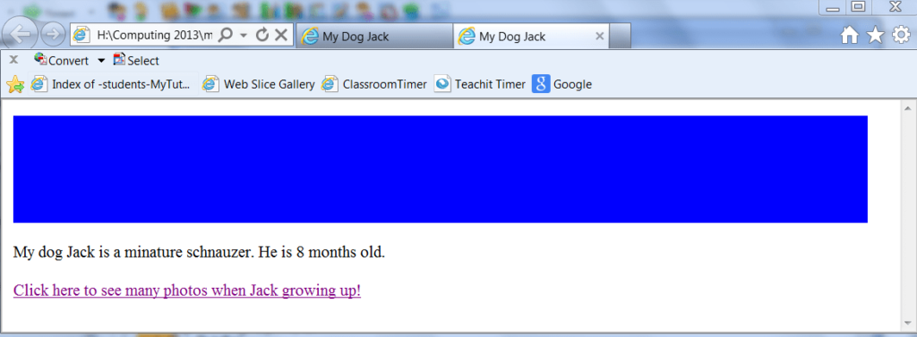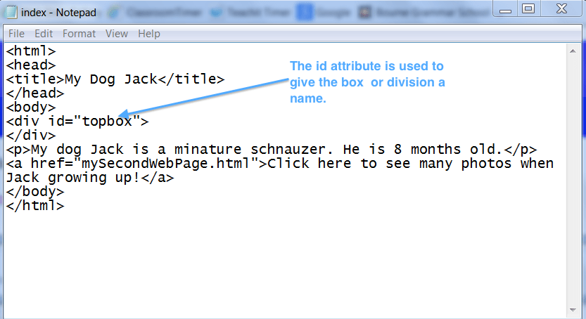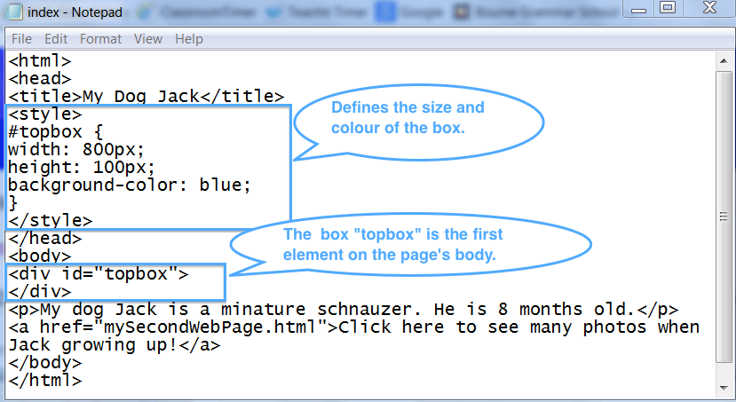 <body> <div id="topbox"> <h2>My Dog Jack</h2> </div> <p>My dog Jack is a miniature schnauzer. He is 8 months old.</p> </body> </html>