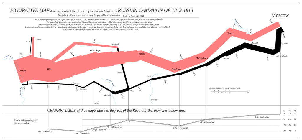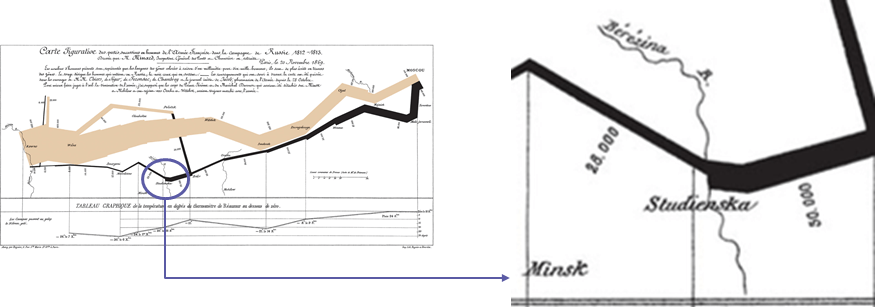 The visualisation also includes elements of geography, such as locations and the rivers the troops had to cross. On 28 September 1813, the data labels on the black line read 50,000, then 28,000. This shows that 22,000 men died crossing the Berezina river near Minsk.